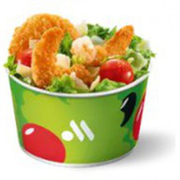 Состав: Хрустящие листья салата айсберг, сочные томаты черри, тертый сыр пармезан и жареные креветки в панировке.