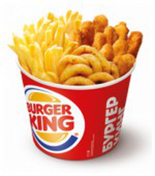 Состав: Сочные стрипсы в хрустящей панировке, луковых колечек и золотистый Кинг Фри.